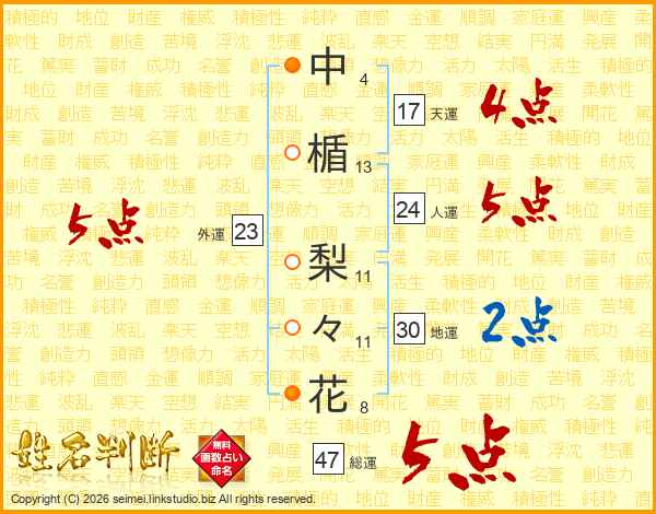 中楯梨々花さんの総運は47画の5点!