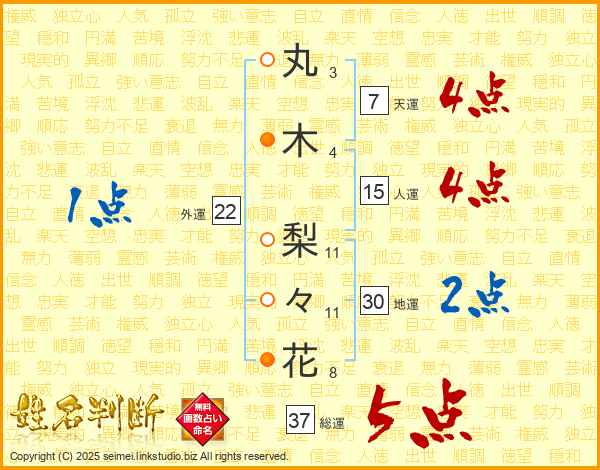 丸(3画)木(4画) 梨(11画)々(11画)花(8画)
