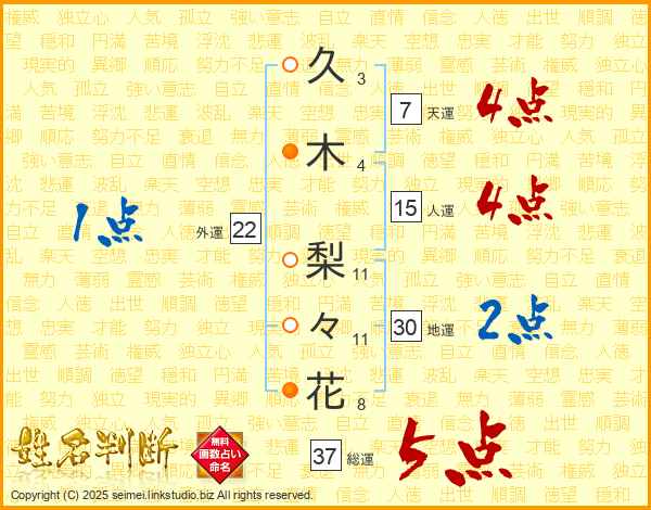 久(3画)木(4画) 梨(11画)々(11画)花(8画)