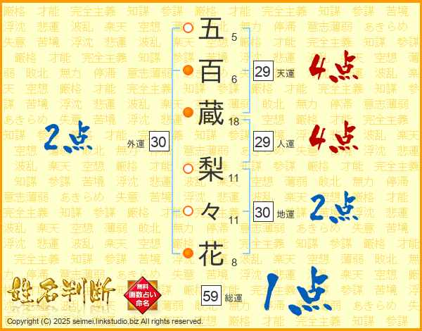 五(5画)百(6画)蔵(18画)  梨(11画)々(11画)花(8画)