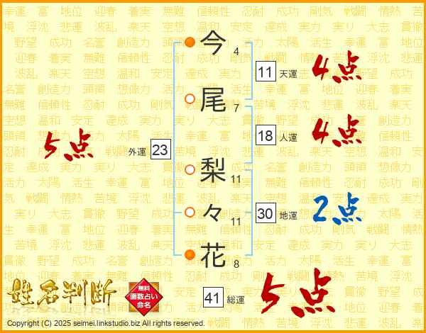 今(4画)尾(7画) 梨(11画)々(11画)花(8画)