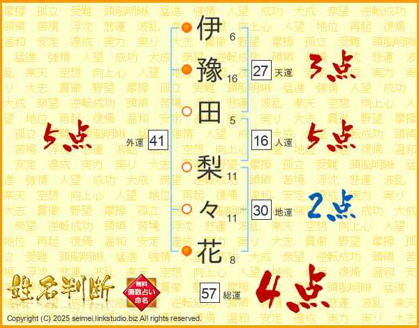 伊(6画)豫(16画)田(5画) 梨(11画)々(11画)花(8画)
