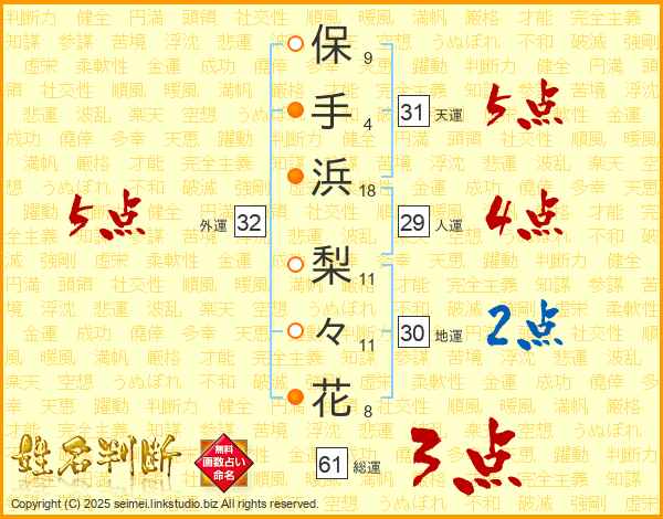 保(9画)手(4画)浜(18画) 梨(11画)々(11画)花(8画)
