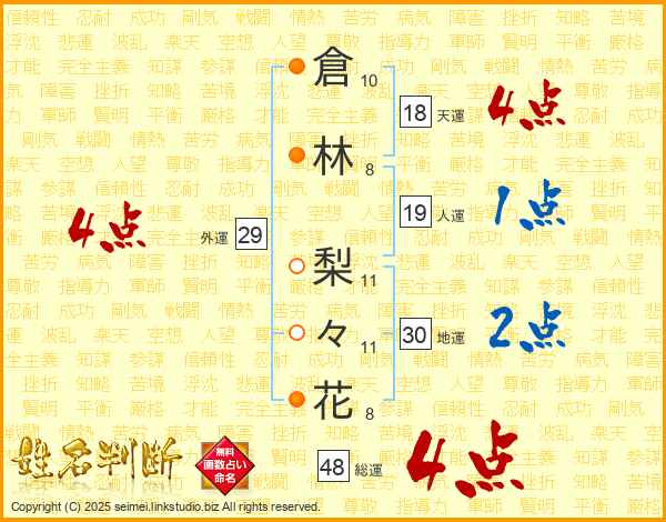 倉(10画)林(8画) 梨(11画)々(11画)花(8画)
