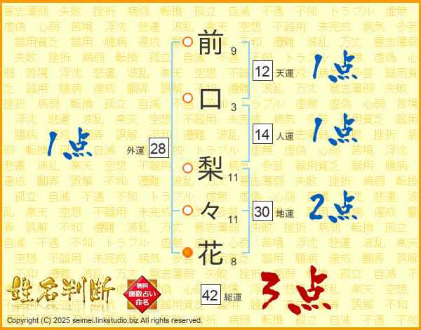 前(9画)口(3画) 梨(11画)々(11画)花(8画)