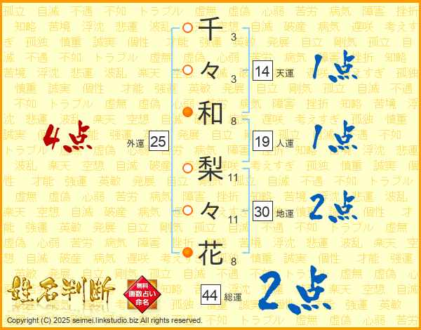 千(3画)々(3画)和(8画) 梨(11画)々(11画)花(8画)