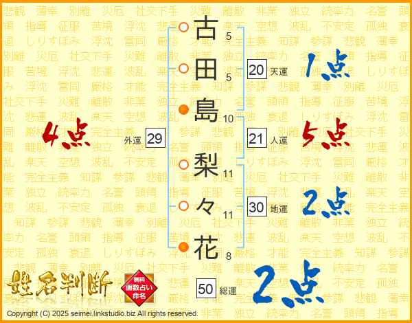 古(5画)田(5画)島(10画) 梨(11画)々(11画)花(8画)