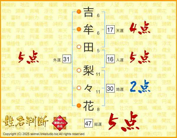 吉(6画)牟(6画)田(5画) 梨(11画)々(11画)花(8画)