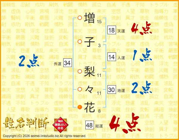 増(15画)子(3画) 梨(11画)々(11画)花(8画)