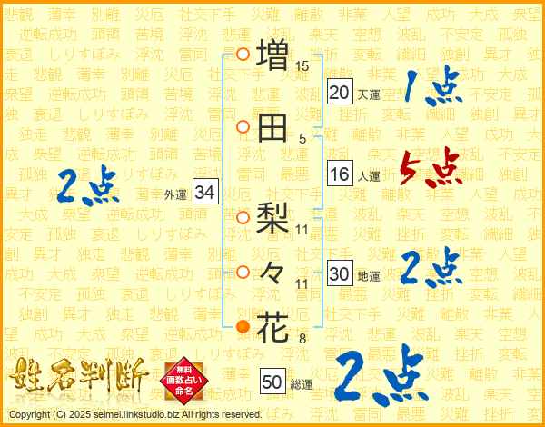 増(15画)田(5画) 梨(11画)々(11画)花(8画)