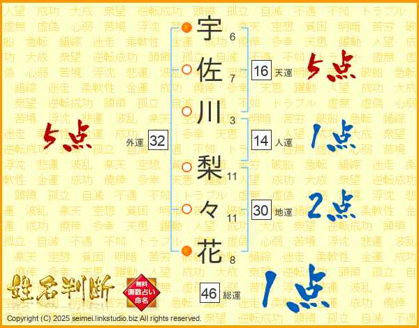 宇(6画)佐(7画)川(3画) 梨(11画)々(11画)花(8画)