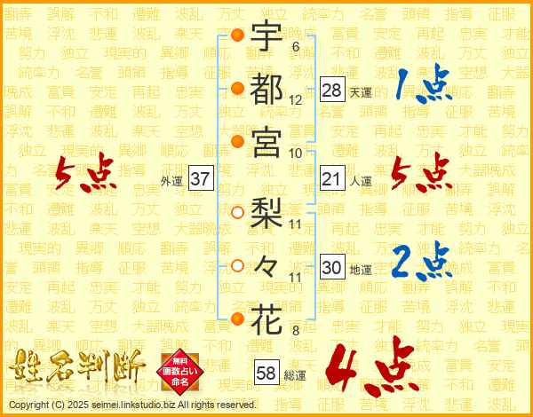 宇(6画)都(12画)宮(10画) 梨(11画)々(11画)花(8画)