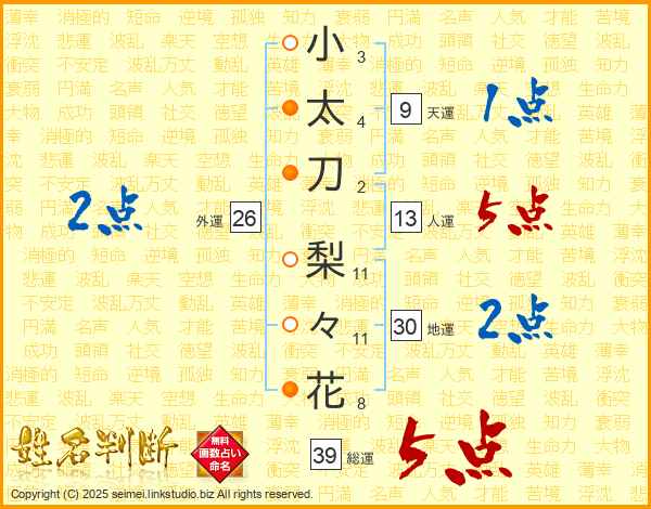 小(3画)太(4画)刀(2画) 梨(11画)々(11画)花(8画)
