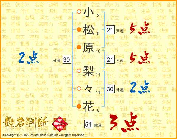小(3画)松(8画)原(10画) 梨(11画)々(11画)花(8画)