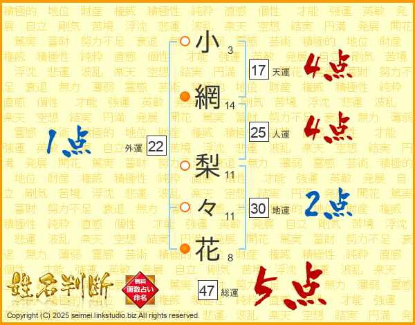 小(3画)網(14画) 梨(11画)々(11画)花(8画)