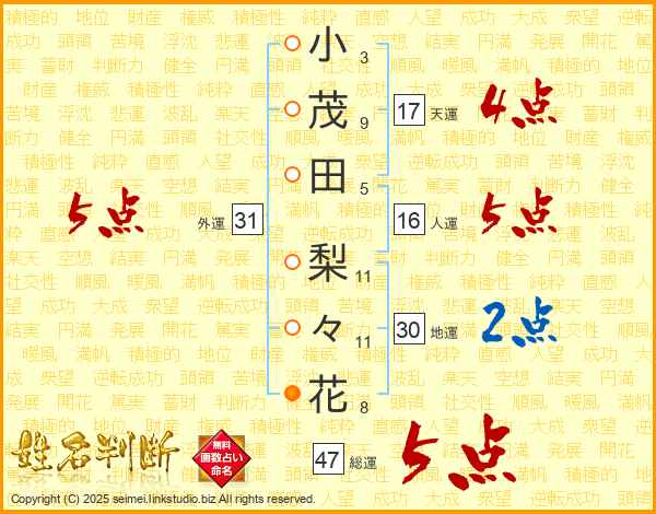 小(3画)茂(9画)田(5画) 梨(11画)々(11画)花(8画)