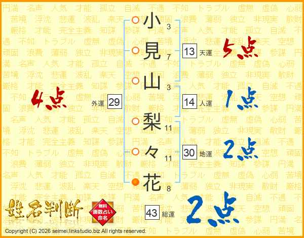 生活面を象徴する運勢です。外部から受ける影響力を表し、結婚運、家庭運や職場、環境への順応性を表します。総運から人運を引いた画数。姓や名が1文字の場合を除く。