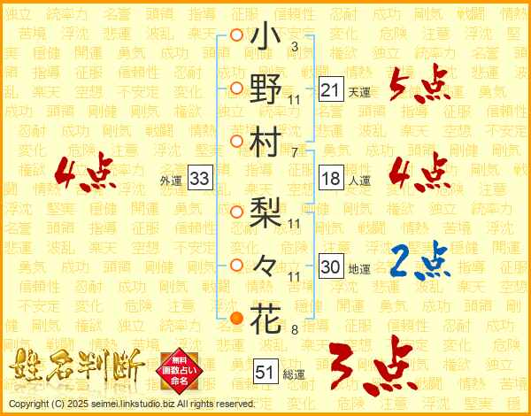 小(3画)野(11画)村(7画) 梨(11画)々(11画)花(8画)