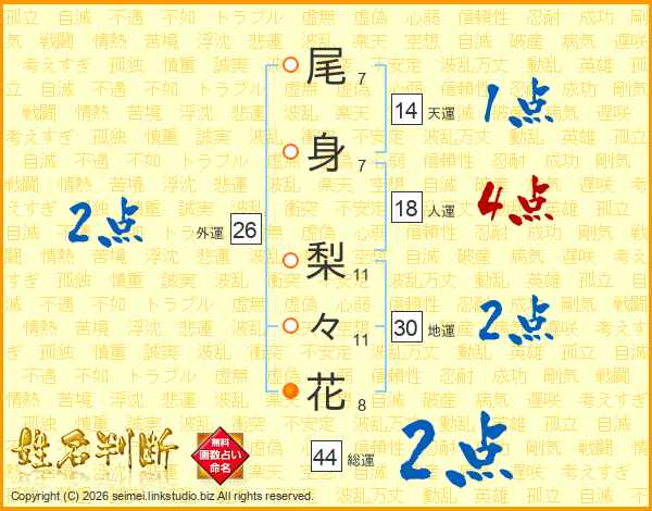 尾(7画)身(7画) 梨(11画)々(11画)花(8画)