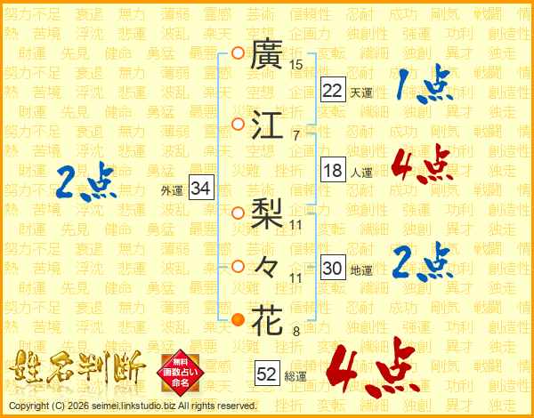 廣(15画)江(7画) 梨(11画)々(11画)花(8画)