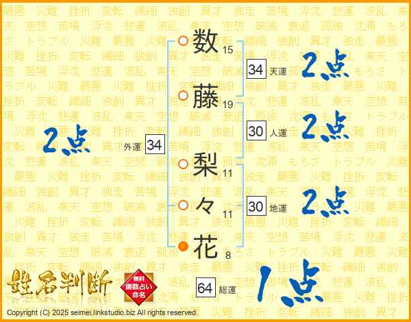 数(15画)藤(19画) 梨(11画)々(11画)花(8画)