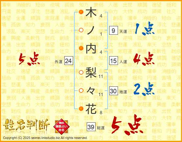 木(4画)ノ(1画)内(4画) 梨(11画)々(11画)花(8画)