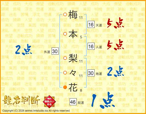 梅(11画)本(5画) 梨(11画)々(11画)花(8画)
