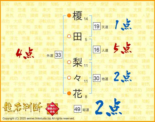榎(14画)田(5画) 梨(11画)々(11画)花(8画)