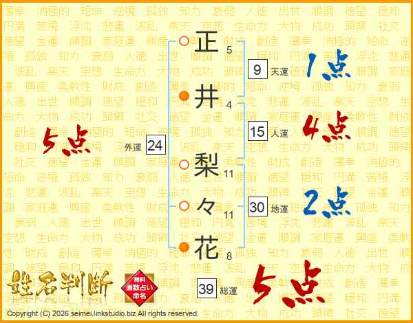 正(5画)井(4画) 梨(11画)々(11画)花(8画)