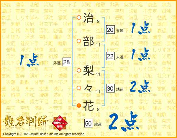 治(9画)部(11画) 梨(11画)々(11画)花(8画)