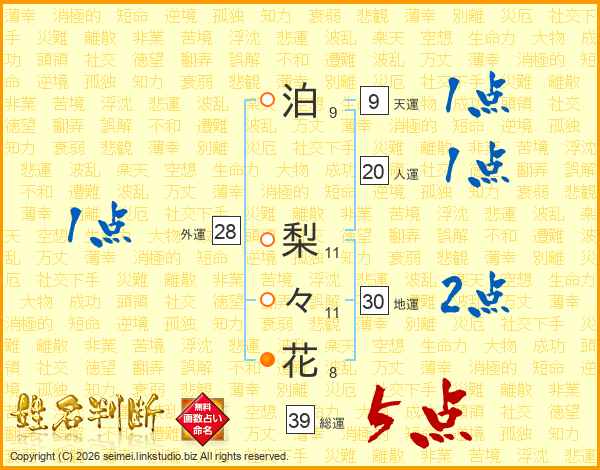 泊梨々花さんの総運は39画の5点!