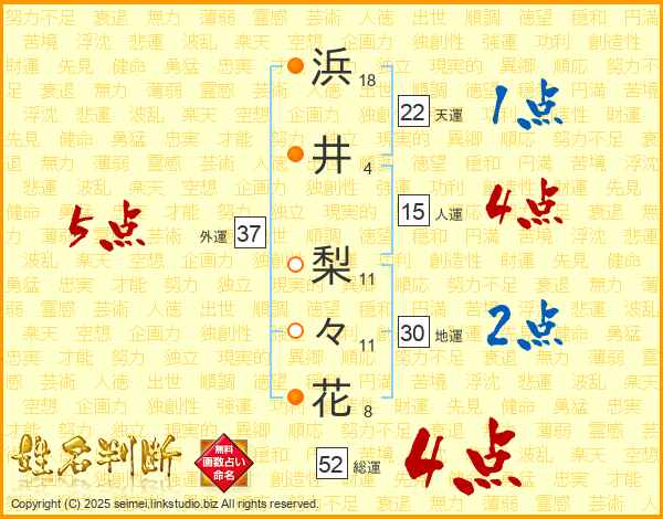 浜(18画)井(4画) 梨(11画)々(11画)花(8画)