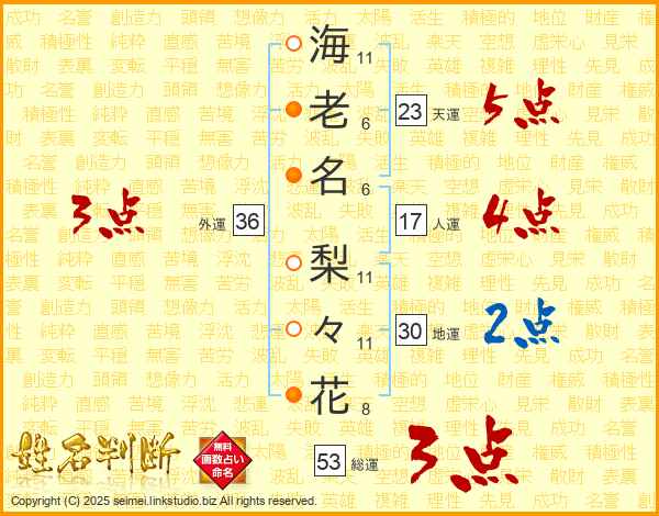 海(11画)老(6画)名(6画) 梨(11画)々(11画)花(8画)