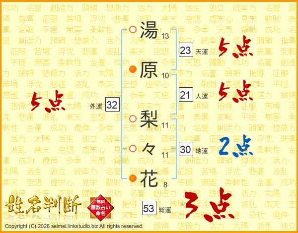 湯(13画)原(10画) 梨(11画)々(11画)花(8画)