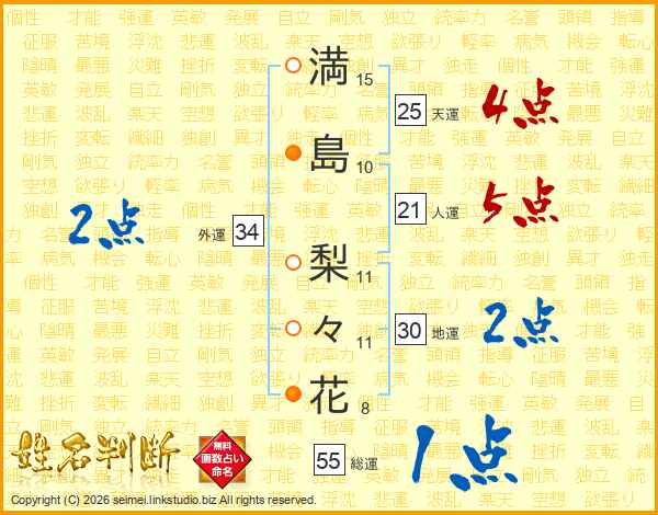満(15画)島(10画) 梨(11画)々(11画)花(8画)