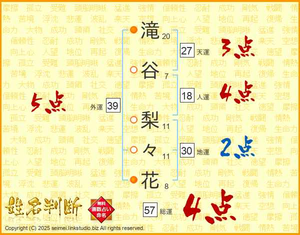 滝(20画)谷(7画) 梨(11画)々(11画)花(8画)