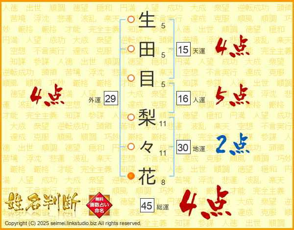 生(5画)田(5画)目(5画) 梨(11画)々(11画)花(8画)
