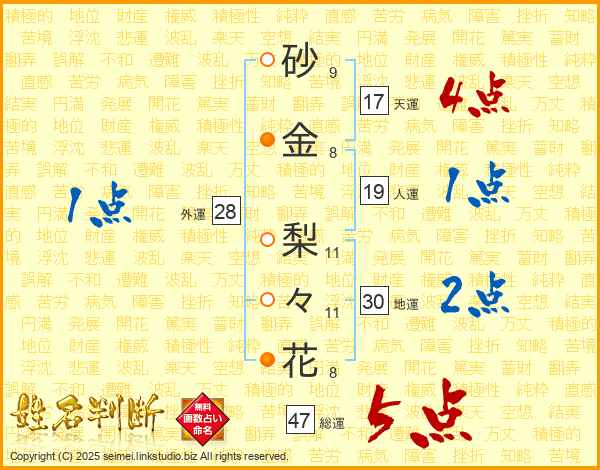 砂(9画)金(8画) 梨(11画)々(11画)花(8画)