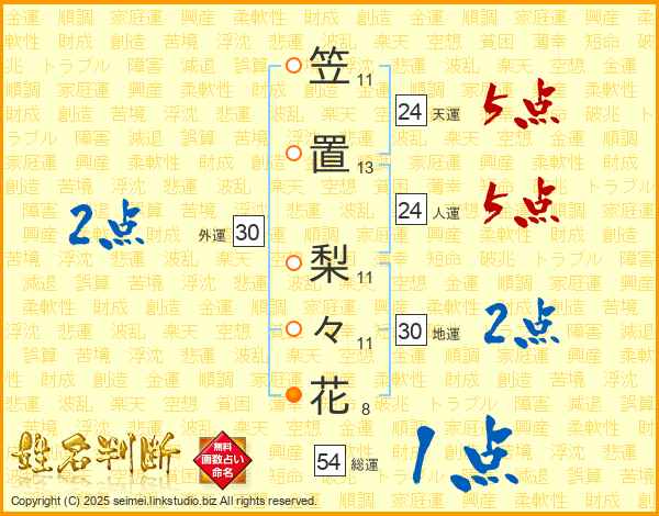 笠(11画)置(13画) 梨(11画)々(11画)花(8画)