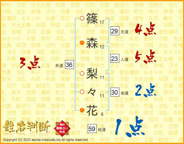 篠(17画)森(12画) 梨(11画)々(11画)花(8画)