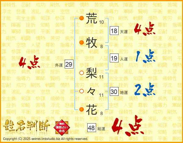荒(10画)牧(8画) 梨(11画)々(11画)花(8画)