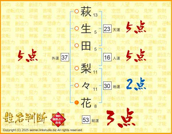 萩(13画)生(5画)田(5画) 梨(11画)々(11画)花(8画)