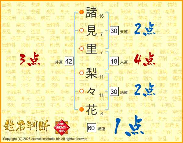 諸(16画)見(7画)里(7画) 梨(11画)々(11画)花(8画)