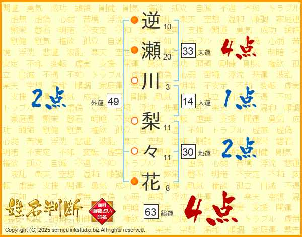 逆(10画)瀬(20画)川(3画) 梨(11画)々(11画)花(8画)