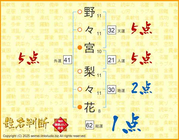 野(11画)々(11画)宮(10画) 梨(11画)々(11画)花(8画)