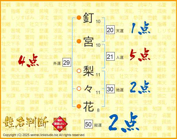 生活面を象徴する運勢です。外部から受ける影響力を表し、結婚運、家庭運や職場、環境への順応性を表します。総運から人運を引いた画数。姓や名が1文字の場合を除く。