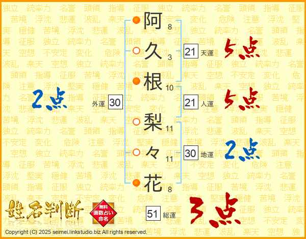 阿(8画)久(3画)根(10画) 梨(11画)々(11画)花(8画)