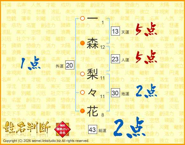 一(1画)森(12画) 梨(11画)々(11画)花(8画)