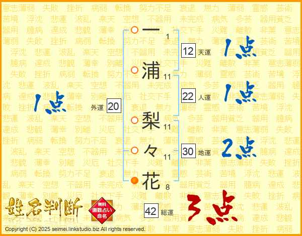 一(1画)浦(11画) 梨(11画)々(11画)花(8画)