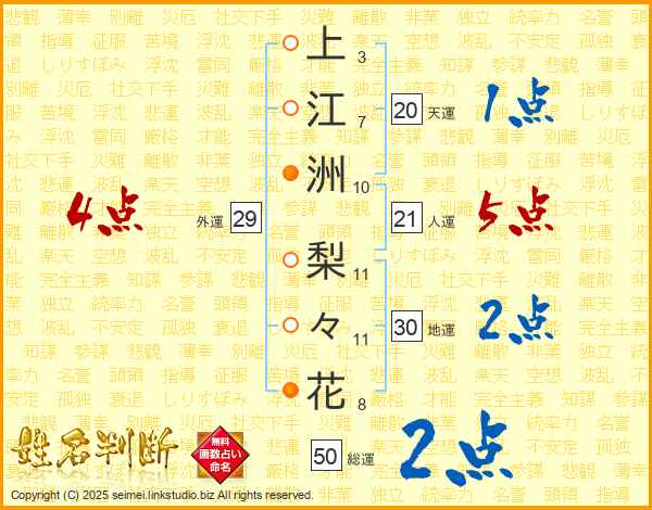 生活面を象徴する運勢です。外部から受ける影響力を表し、結婚運、家庭運や職場、環境への順応性を表します。総運から人運を引いた画数。姓や名が1文字の場合を除く。